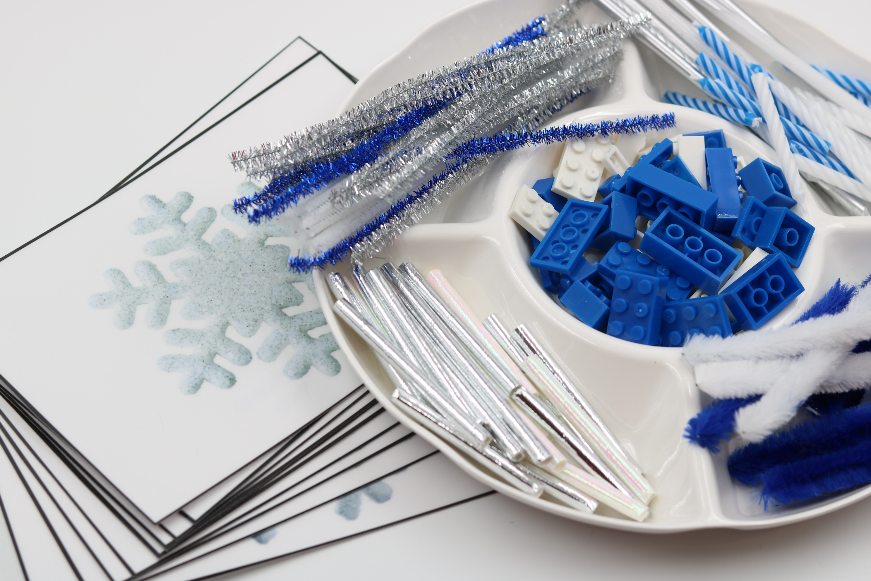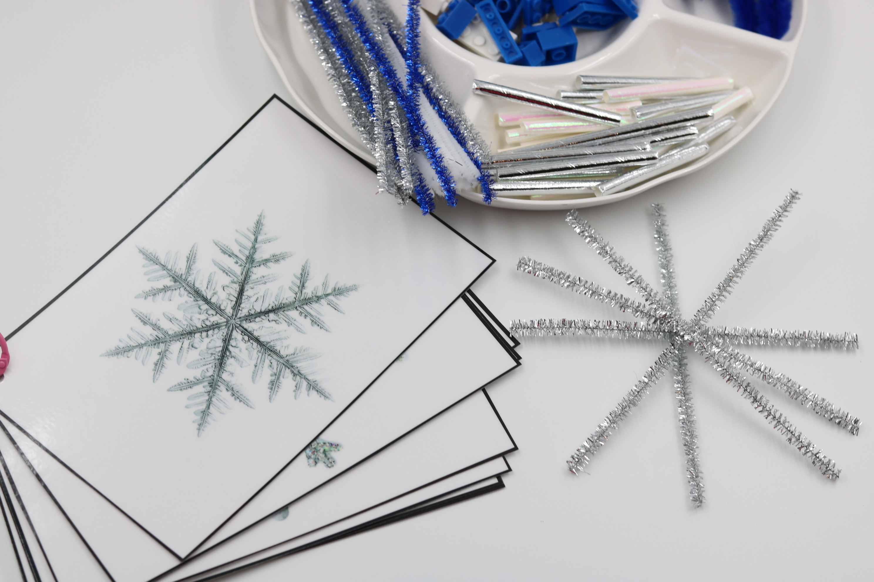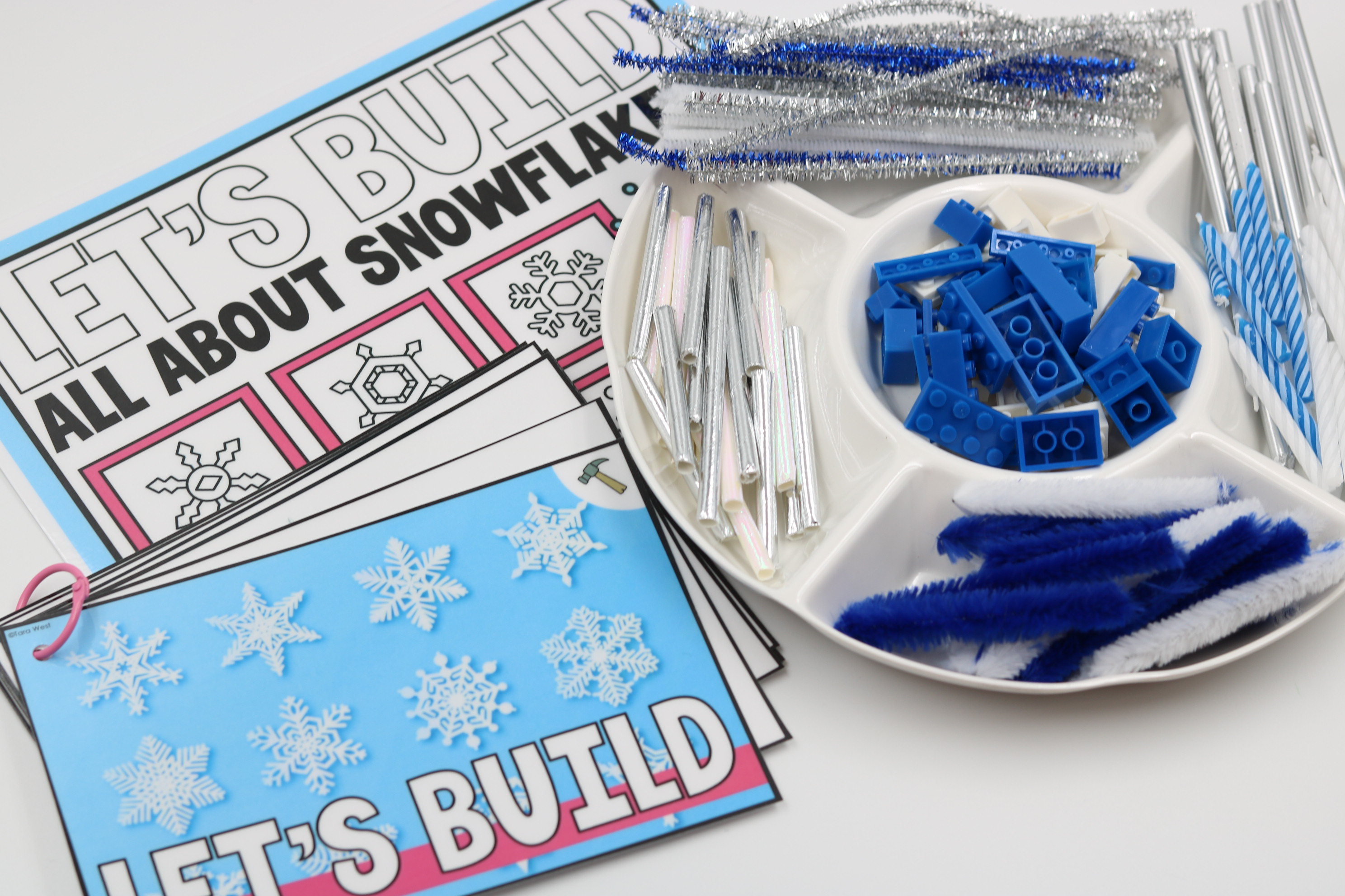 Students can build snowflakes using hands-on items such as cut-up straws, pipe cleaners, beads, dough, craft sticks, buttons, and other classroom materials, making this an easy-to-adapt and highly engaging January center.