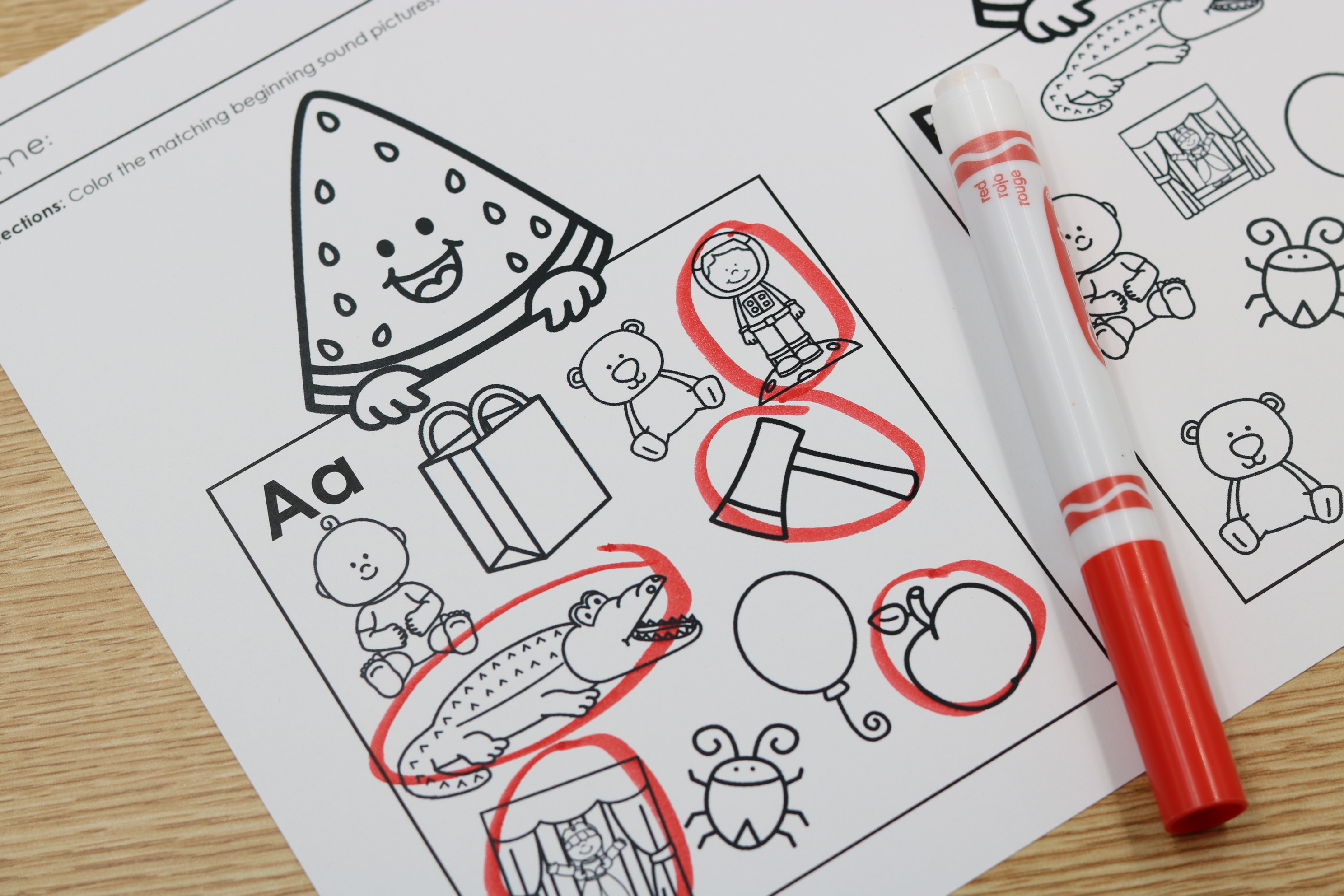 Students work through a variety of tasks including identifying beginning sounds, decoding words, and counting sets. Each page follows a clear format so students can focus on skill practice while building confidence.