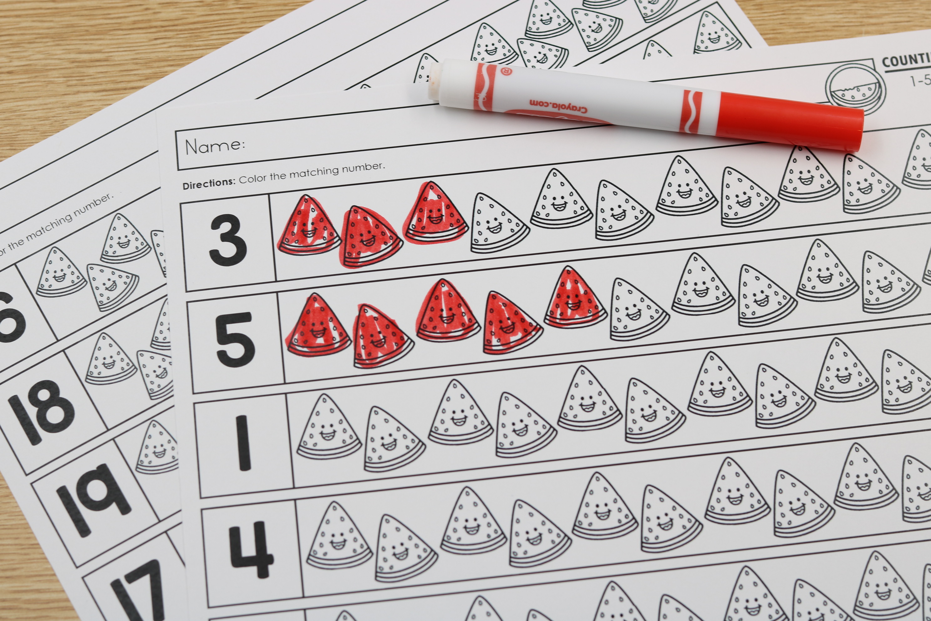 The phonics portion includes activities where students decode words and match them to pictures, helping reinforce sound to symbol connections. The math portion includes counting and number recognition tasks to build number sense to 20.