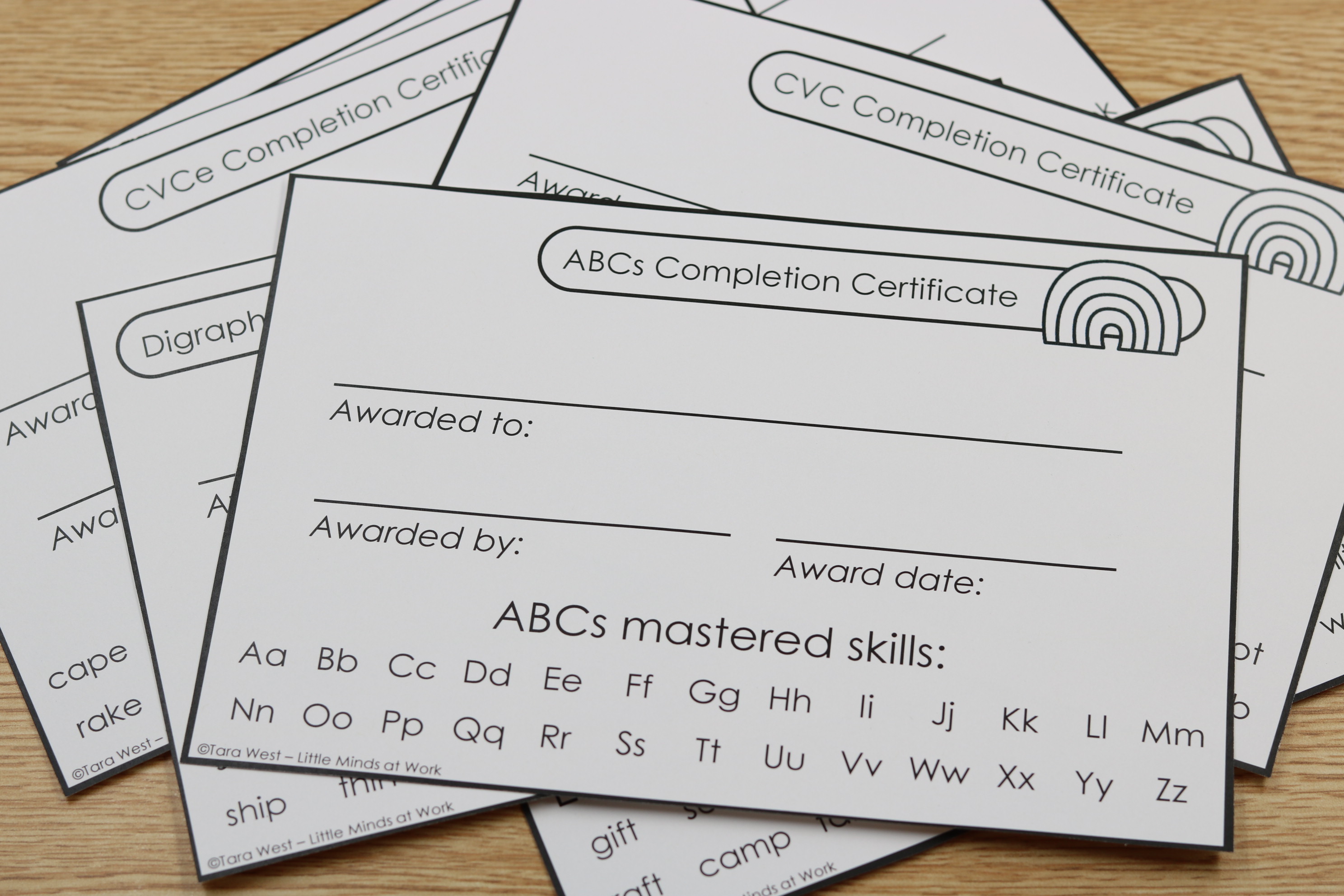• Skill based certificates (ABCs, CVC, digraphs, blends, CVCe, vowel patterns)