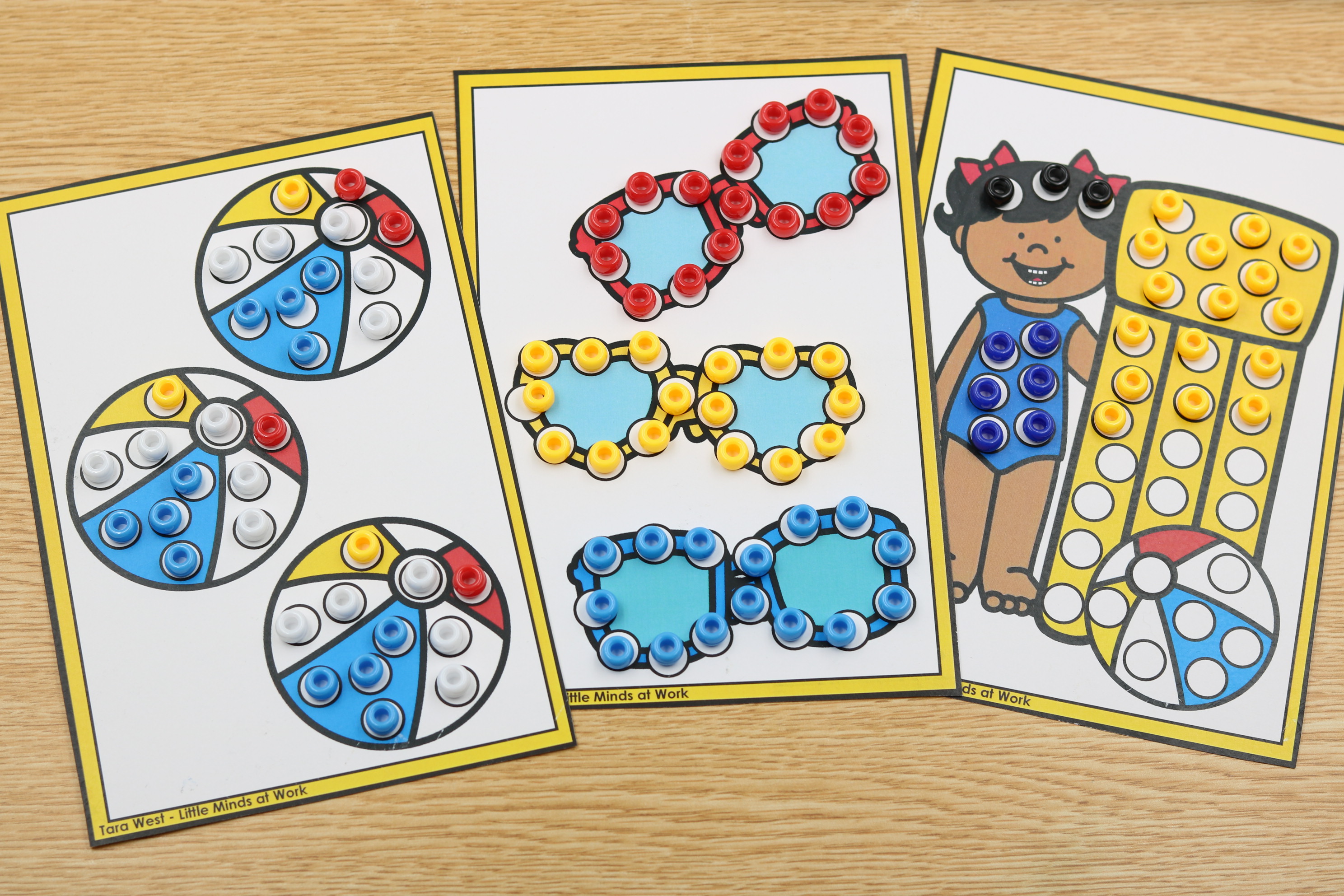 This May fine motor freebie includes summer pony bead builder mats for hands on practice. Students place pony beads on the mats to build coordination and strengthen fine motor skills.