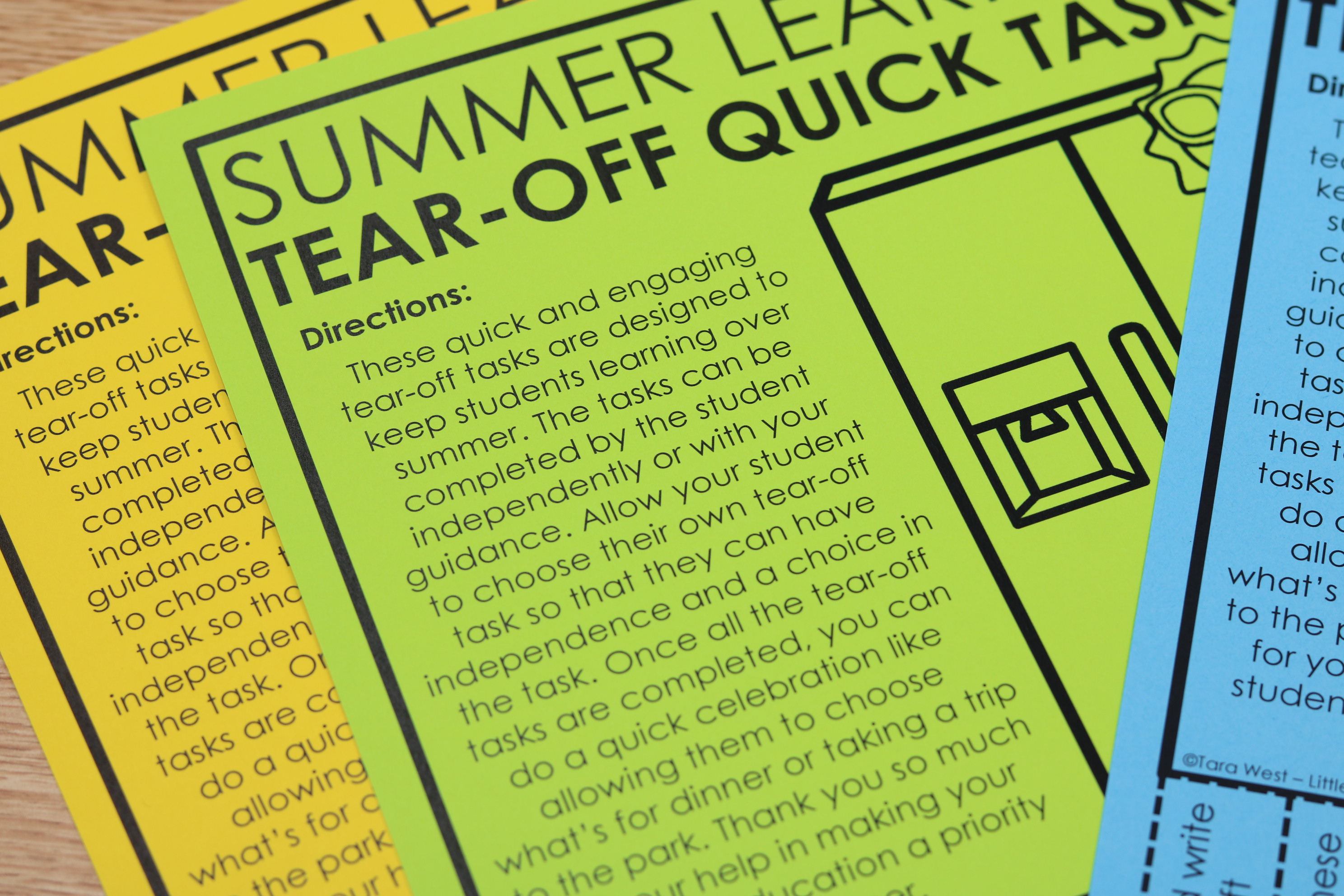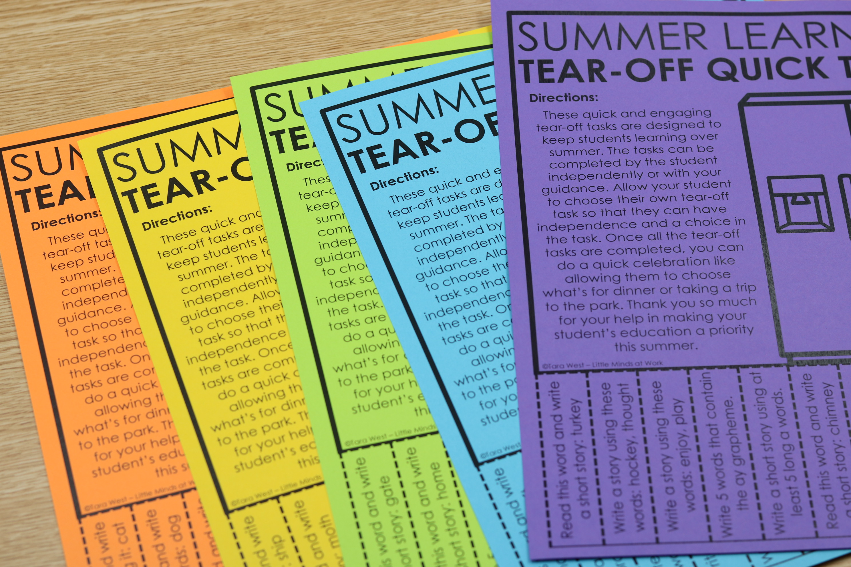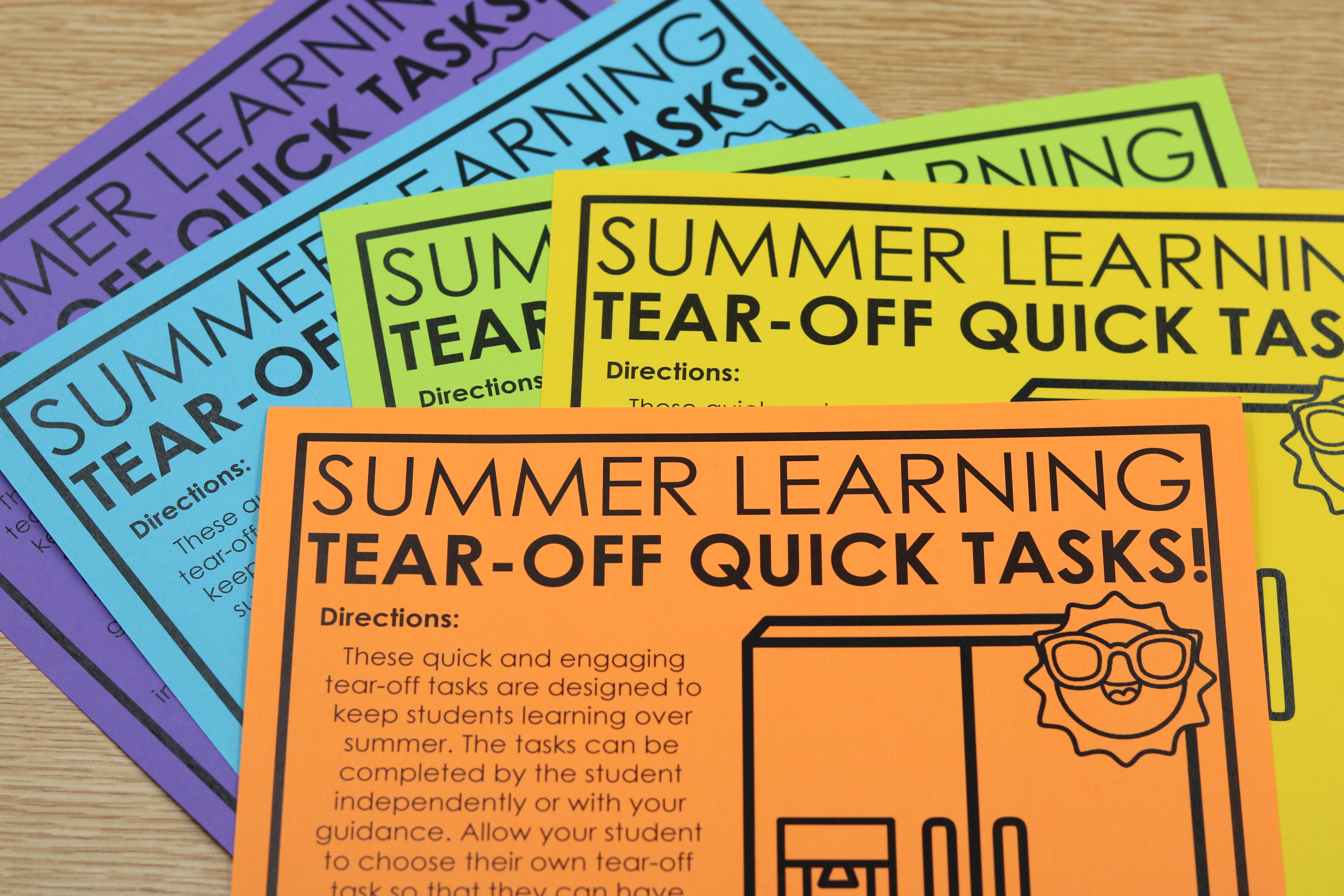 Each page includes multiple tear off tasks that students can complete independently or with support. Students choose a strip, complete the task, and continue building skills throughout the summer.