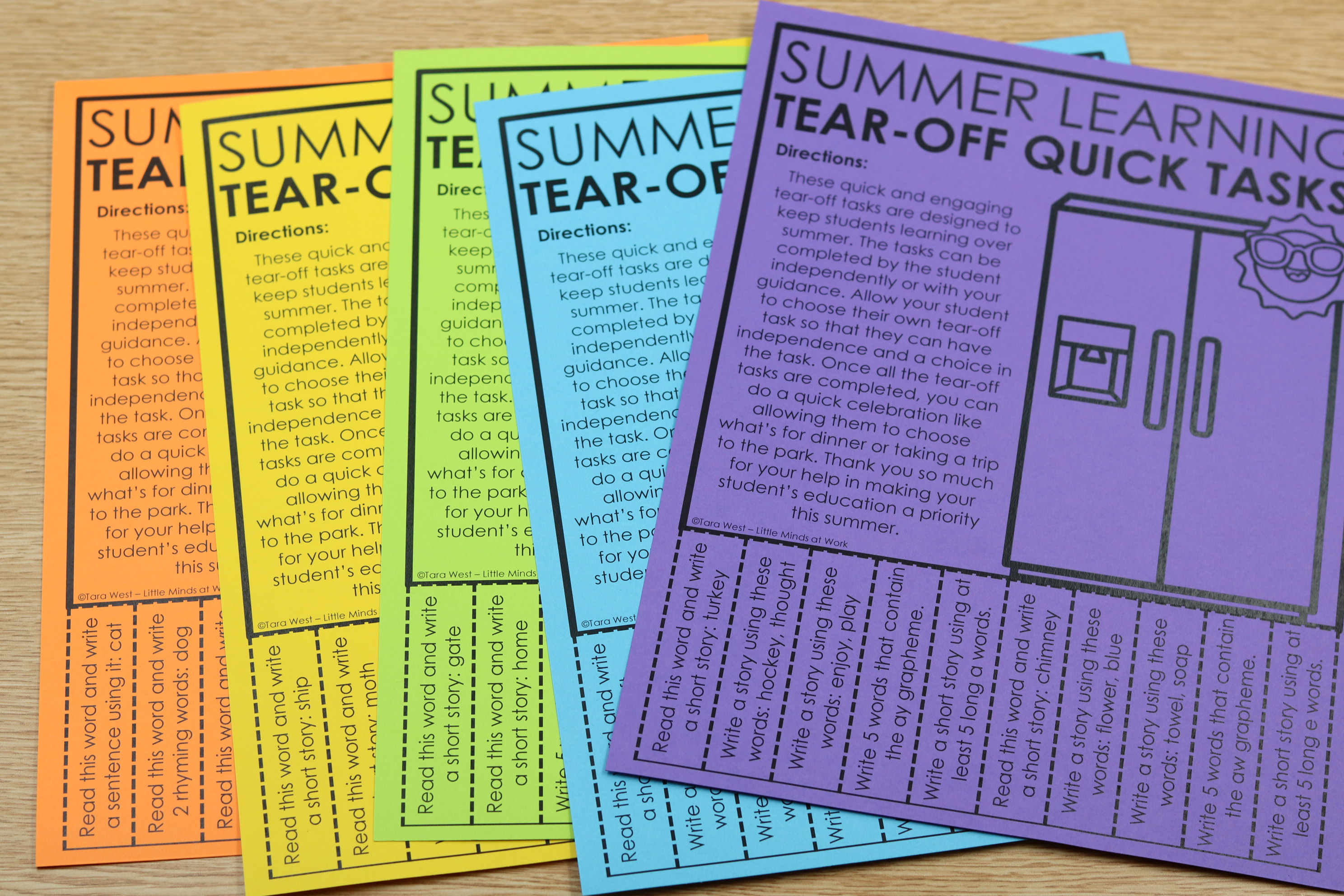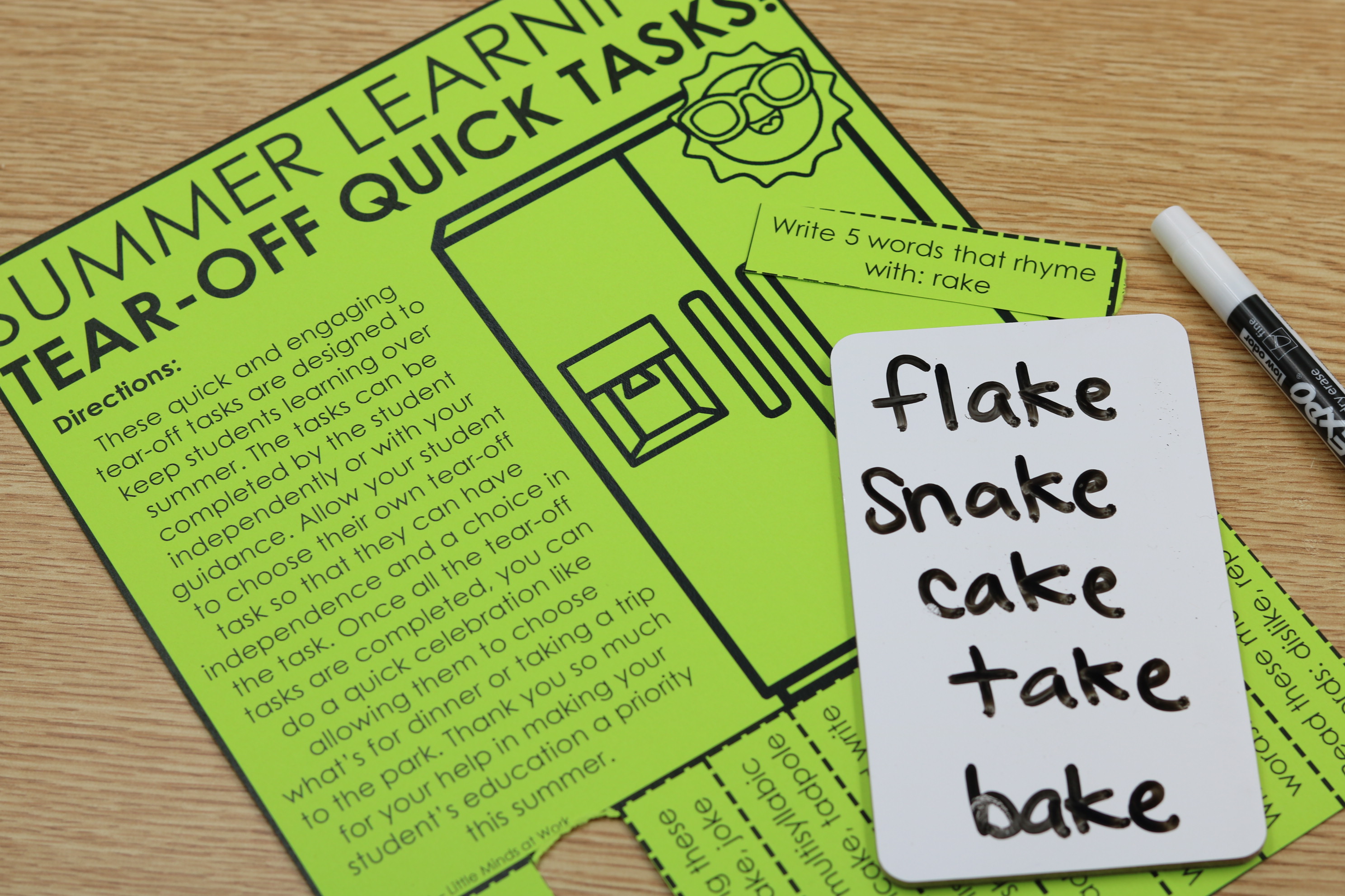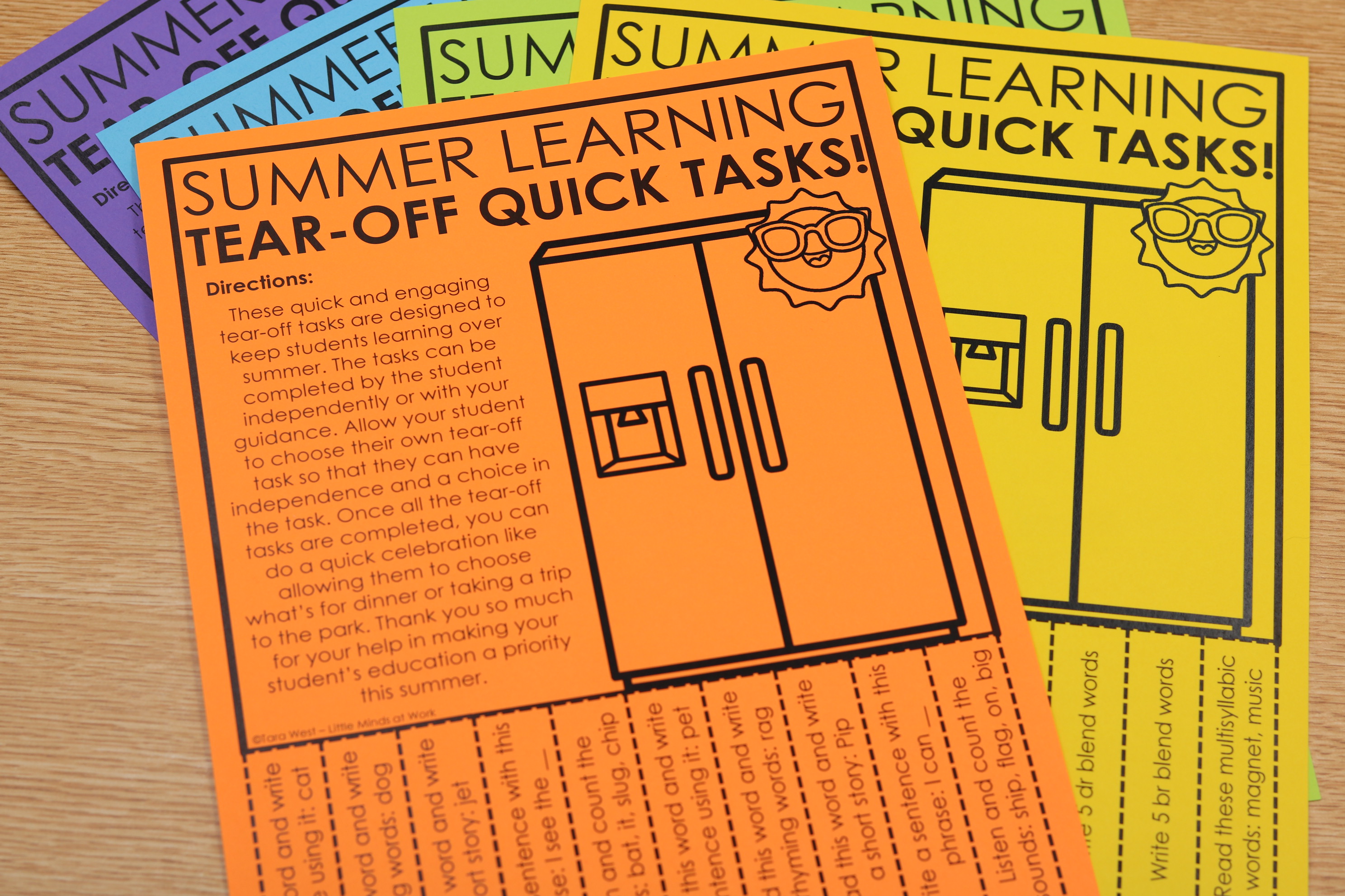 Each page includes multiple tear off tasks that students can complete independently or with support. Students choose a strip, complete the task, and continue building skills throughout the summer.