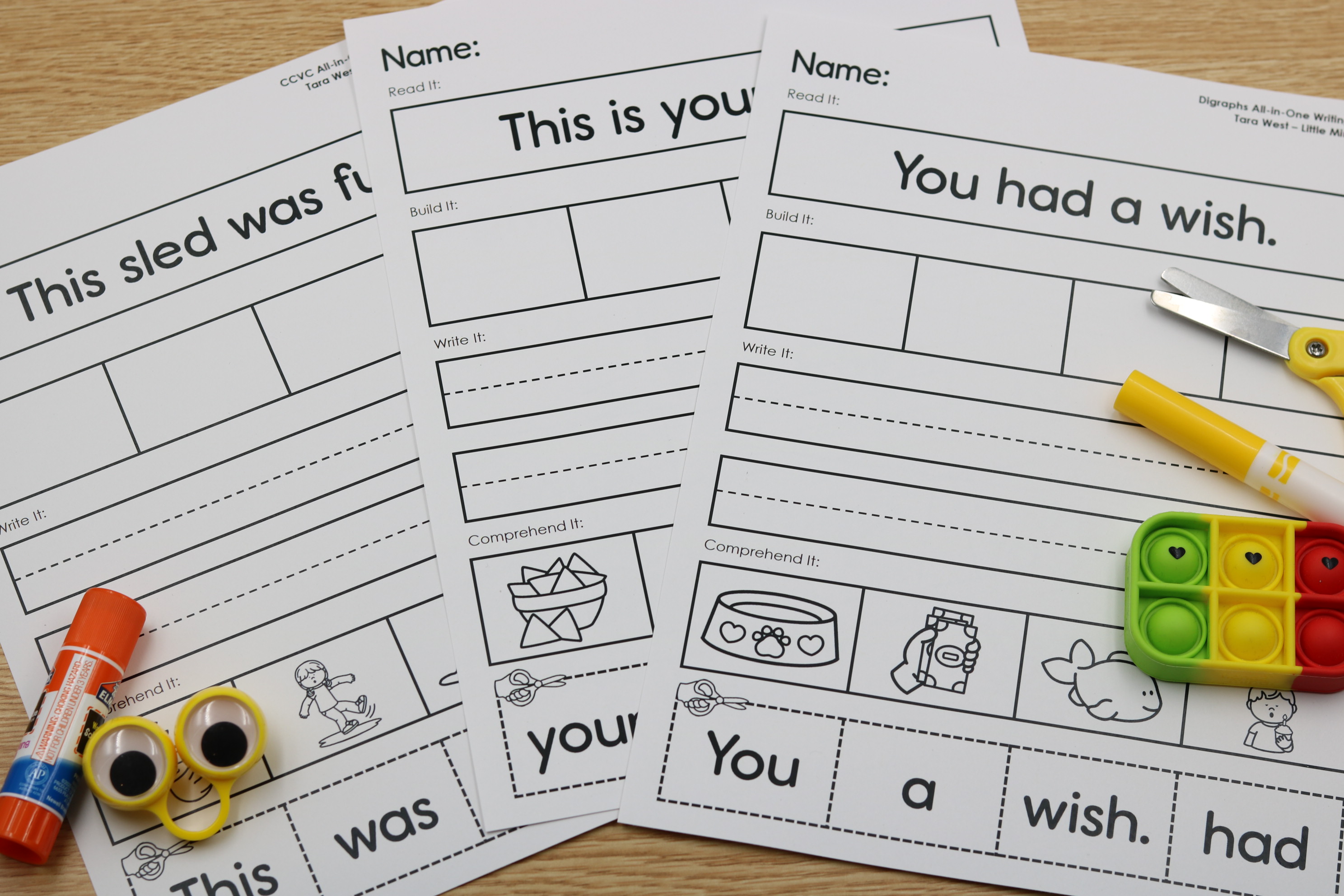 This Writing Digraphs and CCVC Phonics Printables free download includes 12 engaging read it, build it, write it, comprehend it sheets. Students practice decoding, sentence structure, and comprehension in one simple routine.