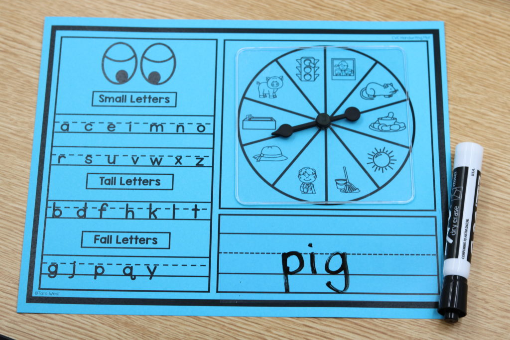 Students will spin the spinner to get a CVC word. Then, the students will use the handwriting assistant on the left side as a visual reminder on where their letters fall within the handwriting lines!